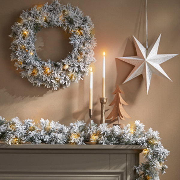 Verlicht en decoreer uw omlijsting, de trapleuning of andere plekken in uw woning met deze feestelijke guirlande. Deze guirlande bestaat uit een combinatie van zachte en harde PVC-naaldjes. De naalden zijn voorzien van een wit laagje kunstsneeuw. Dit geeft de guirlande een echt winterse uitstraling. Dankzij de lengte van 270 cm en diameter van 25 cm, kunt u eenvoudig grote oppervlaktes voorzien van een feestelijk decoratiestuk.