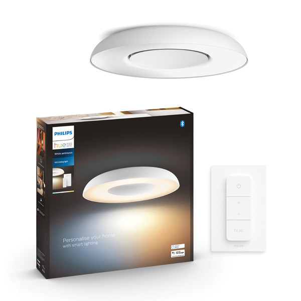 De witte Still plafondlamp van Philips Hue is een moderne, design lamp die niet alleen energiezuinig is maar ook slim is; de lamp kan op afstand worden bediend en wordt geleverd inclusief dimmer switch. Met de dimmer switch kan de plafondlamp draadloos gedimd worden.