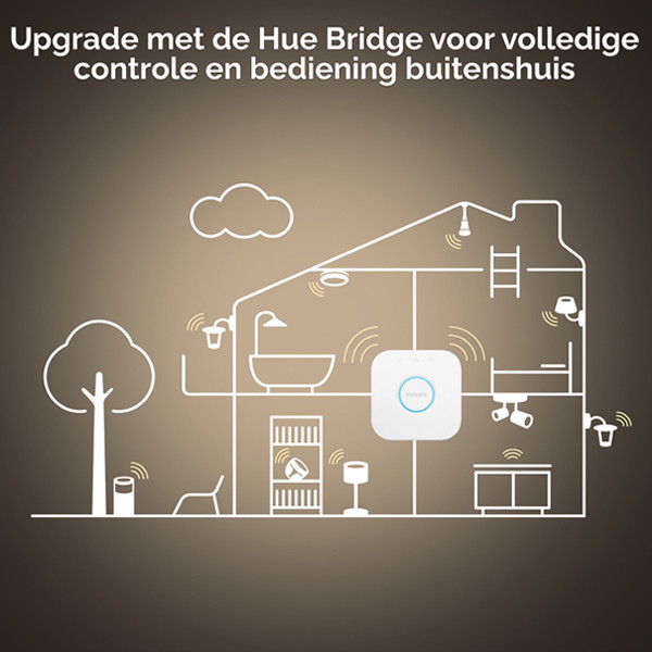 Philips Hue Bridge. Deze gateway zet het wifi signaal van uw lokale netwerk om in een Zigbee signaal. Dit heeft als voordeel dat u tot wel 50 lampen kunt koppelen, en dat u schema's kunt gebruiken om deze te automatiseren.